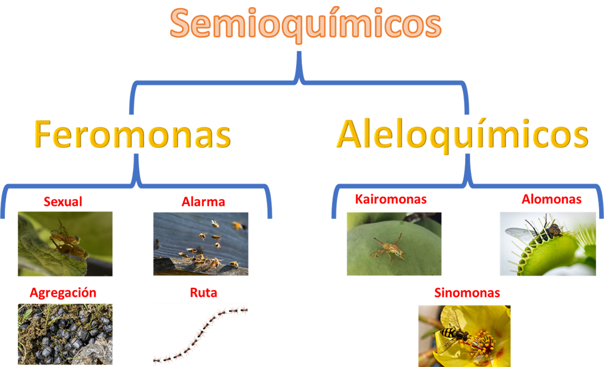 Fig 1. Señales químicas que median las interacciones de los insectos con los de su misma especie (feromonas) o con especies diferentes (aleloquímicos)