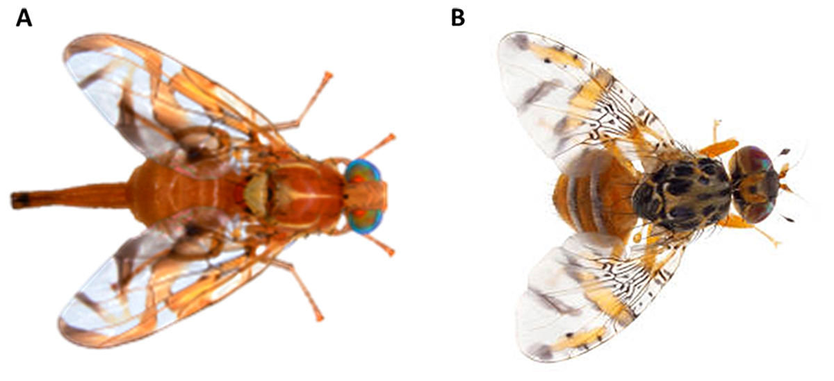 Fig 2. Moscas de la Fruta (Diptera: Tephritidae). A) Mosca Mexicana de la Fruta, plaga de cítricos y mangos en México y Centroamérica. B) Mosca del Mediterráneo, plaga de distribución global que ataca más de 200 especies de frutales y verduras