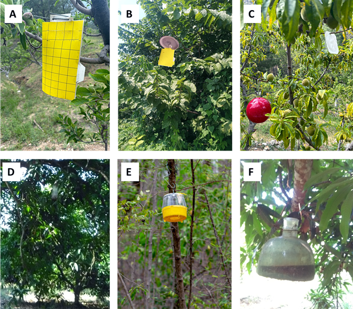 Fig 3. Trampeo con atrayentes para Moscas de la Fruta. Para ello se utilizan diferentes tipos de trampas como paneles de colores que se combinan con una fuente de olores atractivos (A y B), o esferas de diversos colores simulando un fruto a la que igual se le adiciona una fuente de olor (C), o una botella de plástico a la que se le han realizado perforaciones para permitir la entrada de las Moscas de la Fruta, pero no su escape (D) trampa tipo McPhail en forma de embudo (E), y contenedores de plástico o vidrio que se llenan con una fuente de olor líquida y que capturan y matan a las moscas plaga (F).