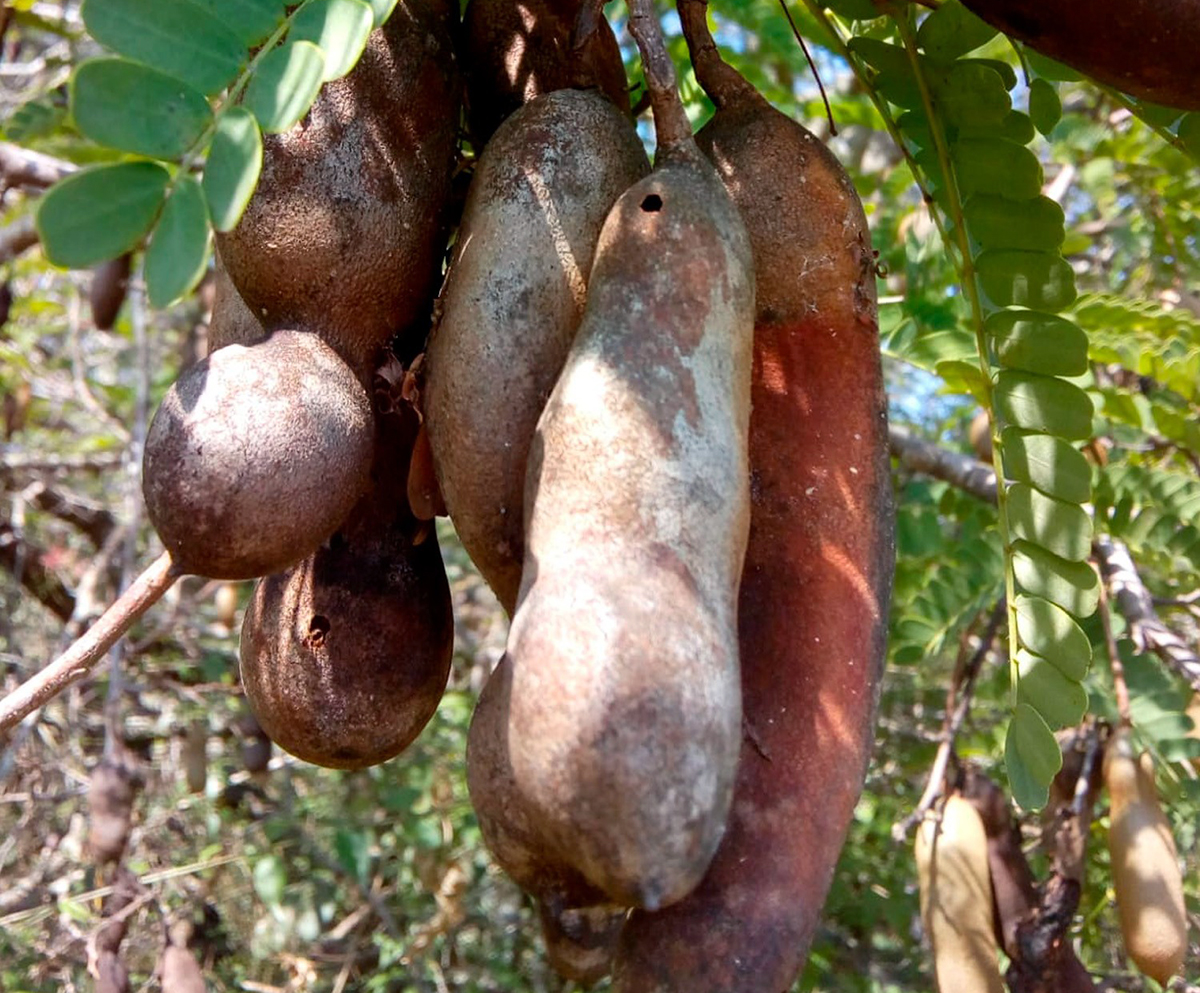 Frutos de tamarindo con perforaciones de insectos depredadores de semillas