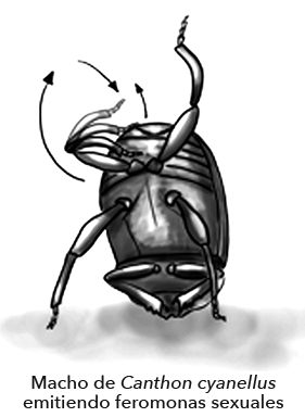 Slider: Macho de Canthon cyanellus emitiendo feromonas sexuales junto a bola de alimento para atraer a una hembra. En Bellés y Favila 1983.