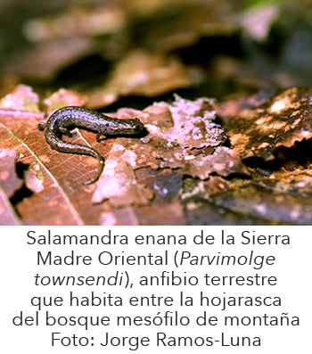 En el mundo hay cerca de 8,700 especies de anfibios, distribuidos ampliamente en casi todos los ecosistemas. Aunque los anfibios son usualmente considerados de “doble vida”, habitando tanto en agua como tierra, existen un gran número de especies que viven, y se reproducen, fuera de ella, entre la hojarasca, rocas o bajo troncos y a esos anfibios se les conoce como terrestres. Para poder sobrevivir en ambientes no acuáticos, los anfibios terrestres requieren de un microclima ideal, que les provea de una alta humedad y una temperatura templada o fresca lo más constante posible (incluso en temporadas de sequía y calor). Específicamente, en los fragmentados bosques de niebla de Xalapa y alrededores, decenas de especies de salamandras sin pulmones o también conocidos como tlaconetes (Familia Plethodontidae), varias ranitas de hojarasca (Familia Craugastoridae), ranitas chirriadoras (Familia Eleutherodactylidae) y algunos sapos (Familia Bufonidae), encuentran además de un agradable lugar para vivir, entre el mantillo tienen a disposición un vasto y nutrido almacén de alimento, encontrando como parte del menú: colémbolos, hormigas, termitas, pulgones, ácaros, arañas, entre otros.