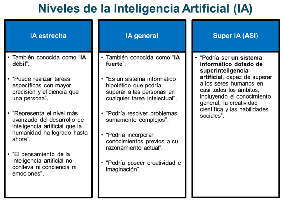 Pero ¿qué debemos entender por IA? De entrada, y analizando el fenómeno desde una perspectiva histórica, todo comenzó con la “IA estrecha”, que derivó en la “IA general” que a su vez derivó en la “Súper IA (ASI)” (entrecomillado por haber sido tomado literalmente de la fuente https://azure.microsoft.com/es-es/overview/what-is-artificial-intelligence/#how). Basándonos en esta misma fuente y parafraseando/resumiendo varias partes (y por ello el uso de texto entrecomillado para evitar incurrir en plagio), armamos el siguiente cuadro sinóptico para facilitarle el proceso de comprensión del proceso a la/el lectora/lector.