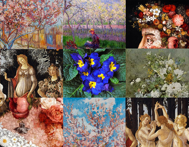 Prímula (al centro) y obras de arte inspiradas en la primavera.