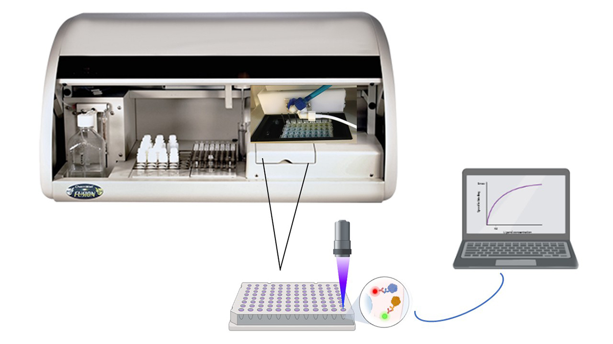 Figura 2. El proceso de CLIA donde las moléculas se unen generando luz que es cuantificada y los resultados se observan en una computadora
