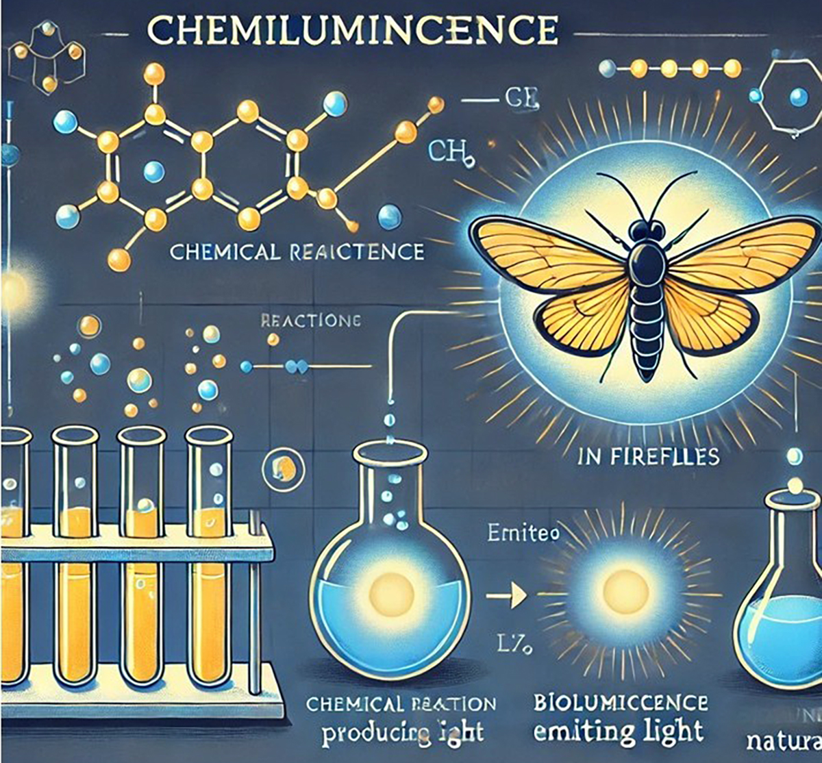 Figura 3. Comparación del proceso de la generación de luz a partir de una reacción química, y el mecanismo de bioluminiscencia de las luciérnagas