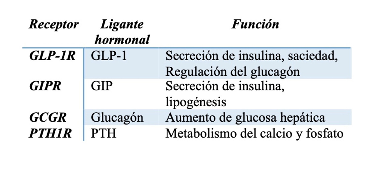 | GLP-1R | GLP-1 | Secreción de insulina, saciedad, Regulación del glucagón |
