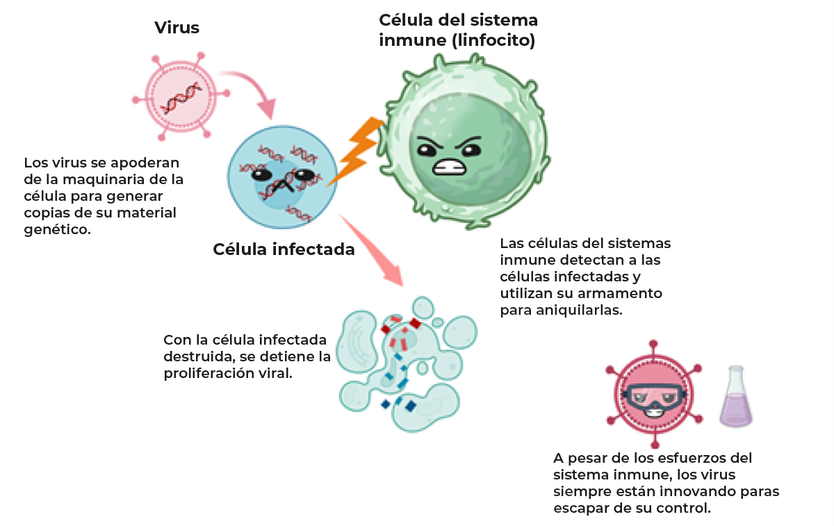 Cada vez que nos infectamos con algún virus, como el resfriado o la varicela, se libra una batalla feroz entre este y nuestro sistema inmune. Por un lado, el virus jaquea las células y las hace trabajar como fábricas de producción de nuevas partículas de virus, mientras por otro lado el sistema inmune despliega diversas sustancias y un ejército de células defensivas para aniquilar a las células jaqueadas y así evitar la proliferación del patógeno. Ciclo tras ciclo de infecciones a lo largo de la historia, nos han mostrado que los virus están en constante cambio a nivel genético para adaptarse y así vencer el sistema inmune del hospedero con el fin de transmitirse a otros individuos susceptibles.
