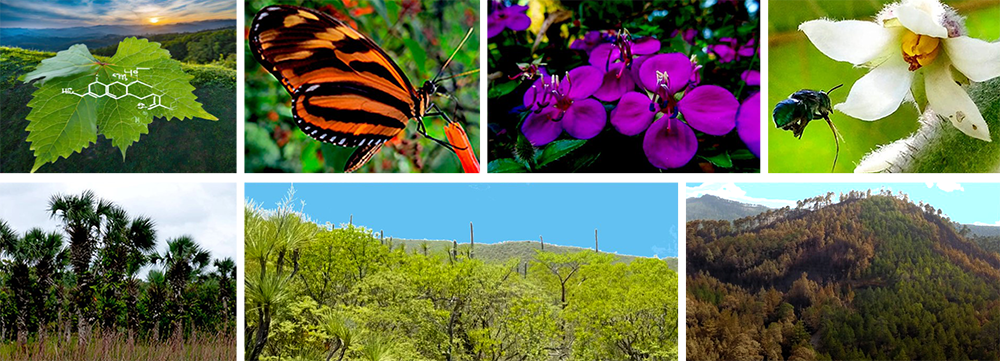 Fig 2. La vida a diferentes escalas: moléculas, individuos, poblaciones, interacciones, ecosistemas y paisajes (Imagen de la hoja con una molécula creada inteligencia artificial; Fotos: Mauricio A. Juárez-Fragoso, Avril Manrique-Ascencio, Roger Guevara)