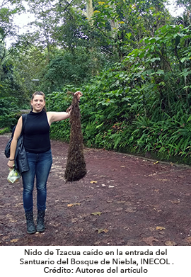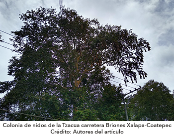 Colonia de nidos de la Tzacua en la entrada al Santuario del Bosque de Niebla, INECOL. En el 2020 se observó la caída de 20 nidos, pero desde 2021 regresaron con éxito.