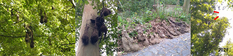 Posteriormente, a para a partir del año 2021 se contabilizaron entre 11 y 25 nidos. En la tercera semana de marzo de 2023 las oropéndolas iniciaron la construcción de sus nidos, específicamente el 12 de abril del presente año, se observaron aproximadamente 37 nidos en la misma área de la entrada al SBN. El establecimiento de esta colonia de oropéndolas en el SBN no ha sido sencillo, ha tenido que enfrentar ciertas dificultades, como las fuertes y constantes lluvias que han derribado sus nidos, no obstante, año con año han regresado y precisamente en esta época es cuando están más activas.