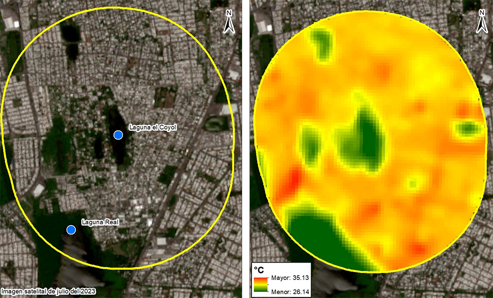 En particular, las 18 lagunas interdunarias antes mencionadas fueron declaradas Sitio Ramsar-1450 por su importancia para la conservación de la biodiversidad y los beneficios que nos proporcionan. De manera similar a otras lagunas interdunarias, las de la Ciudad de Veracruz regulan la temperatura de los alrededores y esto beneficia a los vecinos. Por ejemplo, en la Figura 1 hay dos escenas (izquierda y derecha). Del lado izquierdo se muestra una imagen satelital Sentinel  donde puedes identificar fácilmente a al menos dos lagunas interdunarias de la Ciudad de Veracruz “atrapadas” por el crecimiento urbano. Del lado derecho, se muestra esa misma zona, pero indicando la temperatura superficial que nos permite ubicar zonas con mayor y menor temperatura (cercanas al rojo y cercanas al verde, respectivamente). Si comparamos estas dos escenas podemos observar que las áreas más frías (ver manchones verdes con contornos amarillos) de la derecha coinciden con la ubicación de las lagunas interdunarias de la izquierda. Además, notamos fácilmente que esas áreas de la derecha son más grandes que los cuerpos de agua que vemos en la escena de la izquierda, demostrando que las zonas vecinas a las lagunas interdunarias reciben el servicio de regulación de temperatura que éstas proveen.