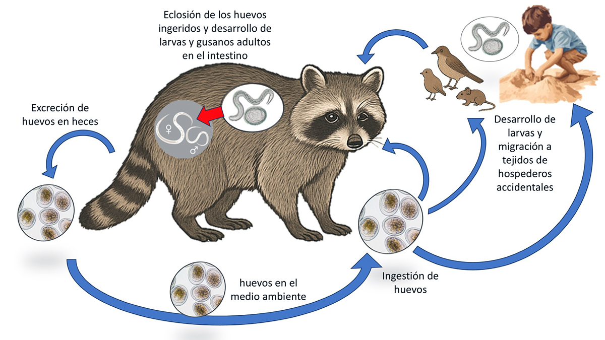 Figura 1. Ciclo de vida del gusano redondo del mapache, Baylisascaris procyonis. Adaptado de Stutz et al. International Journal for Parasitology: Parasites and Wildlife 2024.