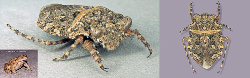Chinche sapo del género Gelastocoris Kirkaldy (Daniel Reynoso Velasco). Recuadro con fotografia de sapo (Bufonidae)