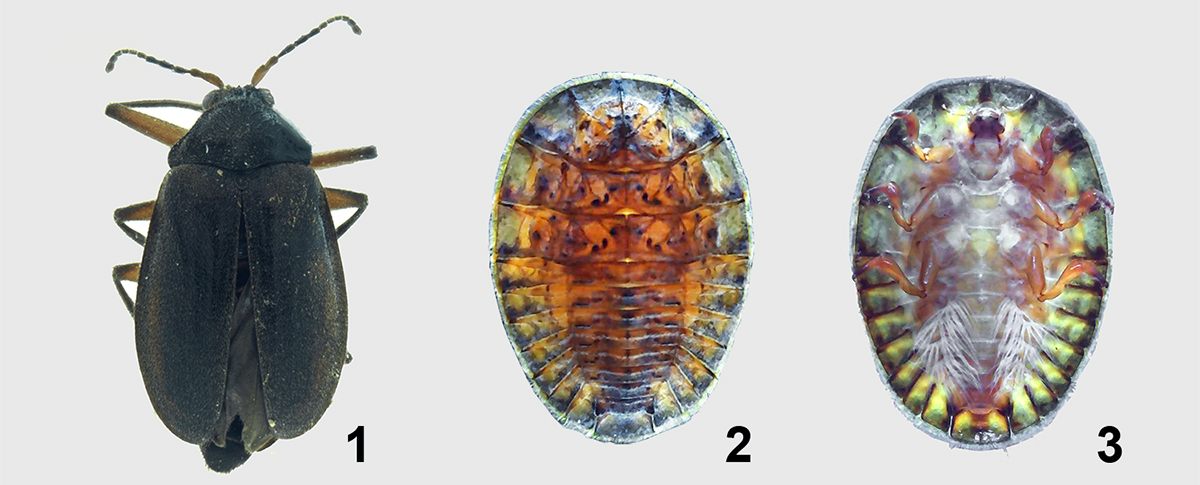 Figuras 1) Vista dorsal de escarabajo adulto de Psephenops lupita Arce-Pérez ; 2) Vista dorsal de larva madura de Psephenus sp.; 3) Vista ventral de larva madura de Psephenus sp.