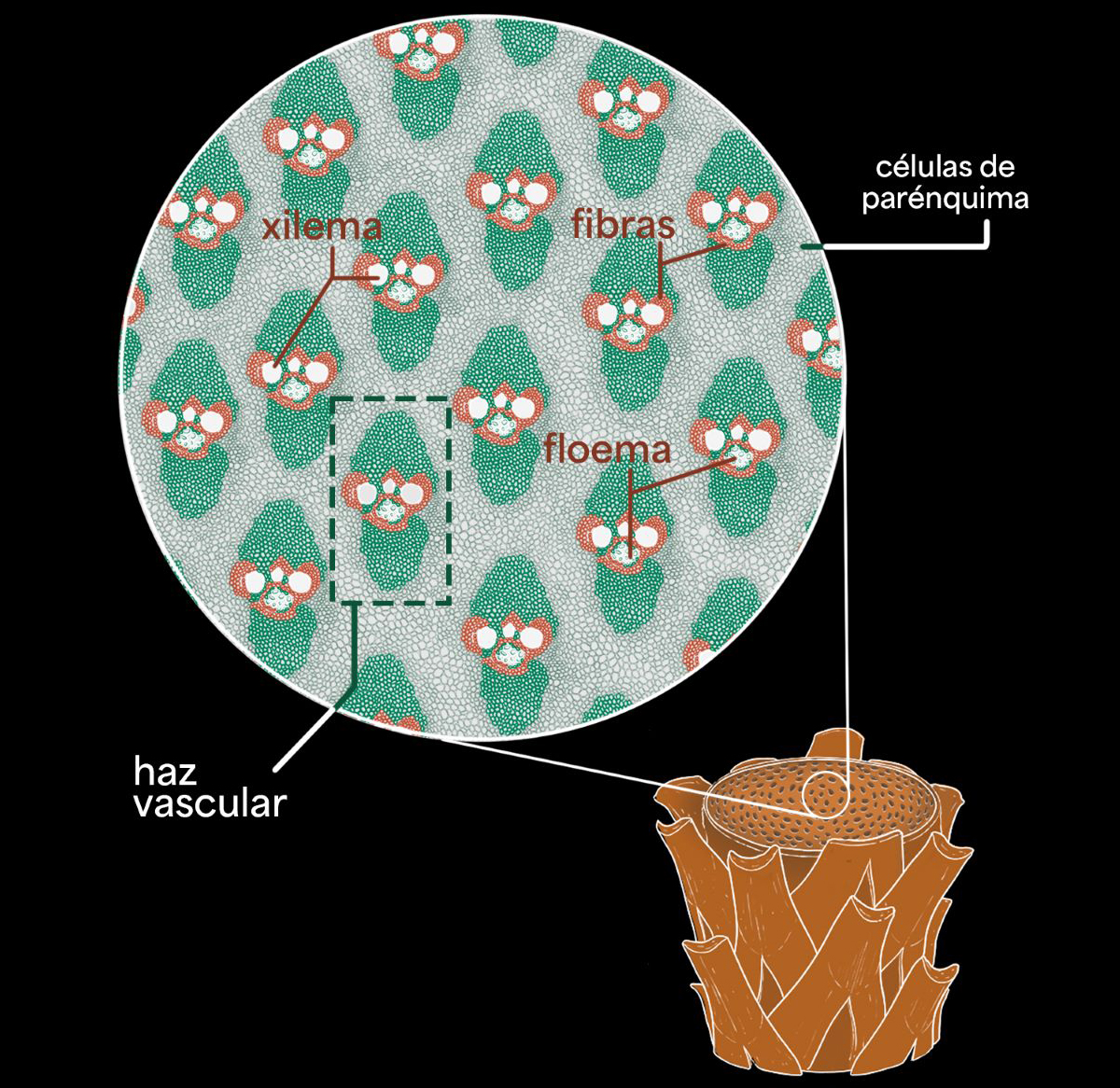 Fig 1. Haces vasculares de las palmas, alrededor del haz vascular se acumula la lignina que la dureza al tejido de las palmas. Crédito: Teresa Jiménez Segura