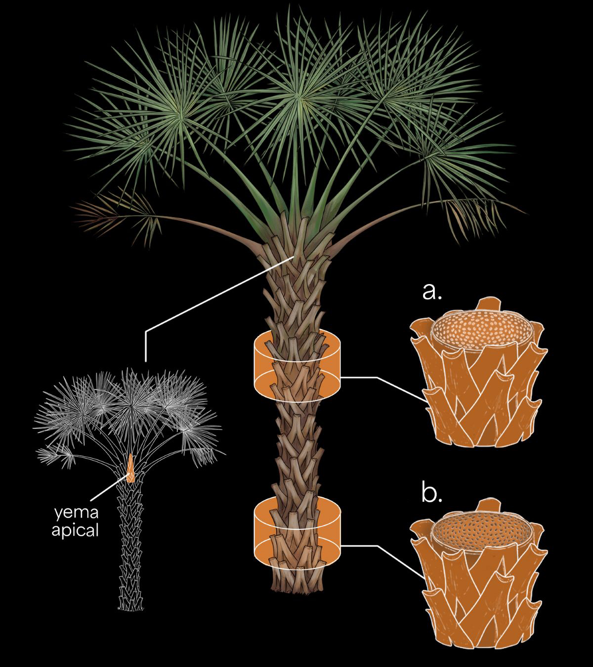 Las palmeras, no son árboles, son plantas arborescentes, parecidas en su forma de vida a los árboles, pero no forman madera, es decir, no tienen crecimiento secundario, sus troncos no engrosan; como los árboles verdaderos. Su tallo, llamado estípite, es el resultado de los restos que perduran de la base de las hojas, de los tejidos conductores y de soporte lignificado, así como, tejido de almacenamiento. El crecimiento en altura de las palmas ocurre por la constante división celular en las yemas de crecimiento apical, ubicadas en la punta del estípite o falso tronco (Figura 1).