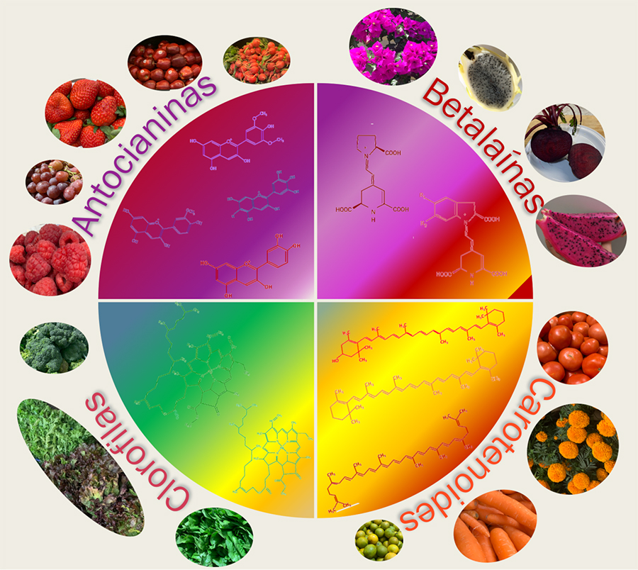Los cuatro grupos de pigmentos naturales: antocianinas, betalaínas, carotenoides y clorofilas. Se ilustran algunos vegetales que los contienen. Victoria Sosa y Arith Pérez-Orozco