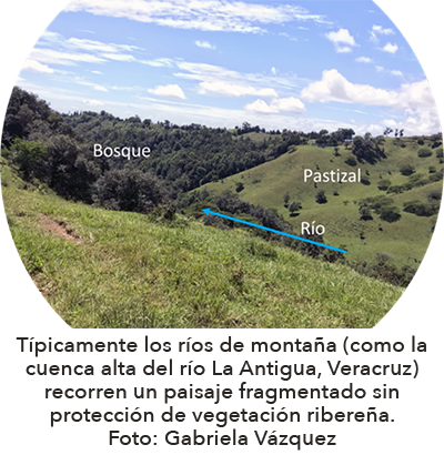 La cuenca alta del río La Antigua en Veracruz, era originalmente una zona de bosque de niebla, pero actualmente es un mosaico de diferentes usos de suelo, como pastizales dedicados a la ganadería y zonas cultivadas para producir principalmente café, papa, maíz y caña de azúcar. Considerando el alto valor de las fuentes de agua en esta zona, investigamos si la presencia de los fragmentos de bosque que se han ido dejando a la orilla de los ríos, ayudan a mejorar la calidad de sus aguas.