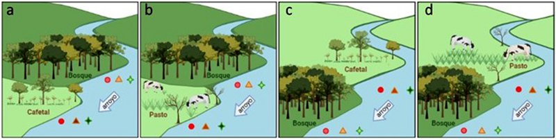Ríos que tienen bosques seguidos de cafetales (a); ríos que tienen bosques seguidos de pastizales (b); ríos que tienen cafetales seguidos de bosque (c); ríos que tienen pastizales seguidos de bosque (d). La temperatura y nutrientes (círculos rojos), sedimentos (triángulo naranja) y clorofila (estrella verde) se incrementaron en las zonas de usos agropecuarios, pero disminuyeron en fragmentos de bosque. Diagramas por Susana Alvarado usando Biorender.
