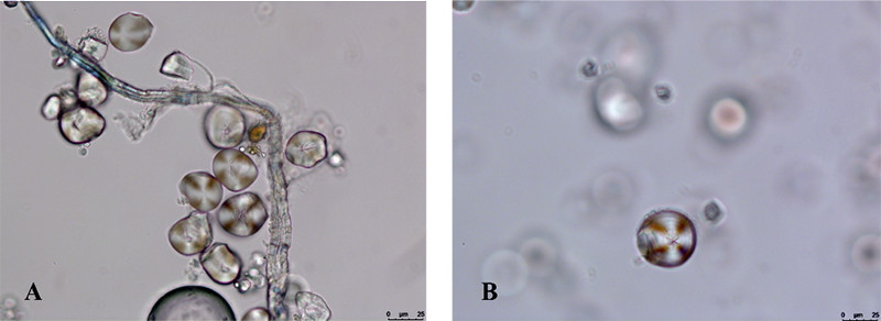 Granos de almidón del tallo de Cícadas bajo luz polarizada. A) Ceratozamia euryphydilla, B) Zamia splenders.