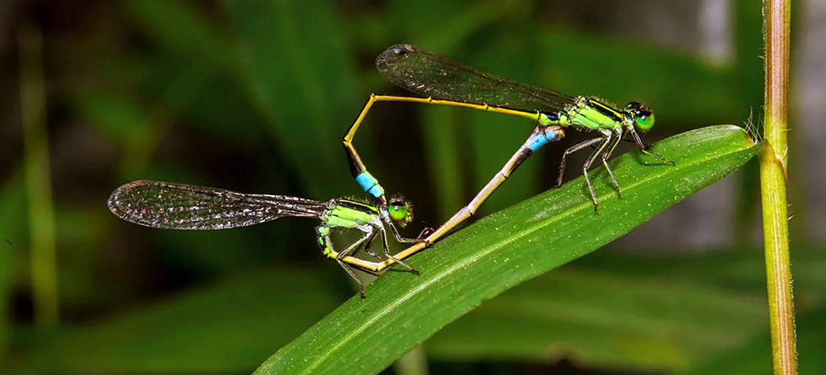 Caballitos del diablo (orden Odonata) en apareamiento. El macho toma a la hembra por la cabeza con el órgano copulador y la hembra dobla el abdomen para permitir la cópula (Foto: Andre Mouton/Pexels)