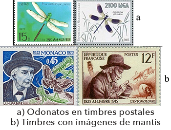 Las libélulas (Odonata) son también populares en los timbres postales (Fig 3a). En varios países orientales como Japón y China, la presencia de las libélulas y caballitos del diablo está relacionada con cosas positivas (buena suerte, buenos deseos) y estos insectos simbolizan el coraje, la fuerza, la victoria y la felicidad. Se les considera benéficos y favorables, probablemente debido a su abundancia en los campos de cultivo de arroz, un alimento muy importante para esas culturas. Históricamente, Japón fue el primer país en representar un odonato en un sello postal en 1923 y hasta 2020 había un total de 426 estampillas emitidas por 113 países. Pese a que para algunos pueblos occidentales la percepción que se tiene hacia estos insectos está vinculada a demonios, duendes y brujas y con ello a cuestiones negativas (mala suerte, calamidades, infortunios, desastres) la tendencia ha ido cambiando. Algunos países americanos han emitido sellos con estos organismos, por ejemplo, el caballito del diablo Mecistogaster ornata, que tiene una longitud de hasta 10 cm y una envergadura alar de 12 cm fue representada en un sello de El Salvador en 1985. Los odonatos también han sido incluidos en estampillas como parte de la cadena alimenticia, esta interacción se representa en el sello emitido por China en el 2006 que ilustra al abejaruco cola azul, un ave migratoria (Merops philippinus) cazando a la libélula halcón de los pantanos de cola carmesí (Orthetrum pruinosum neglectum). Por último, Estados Unidos y Suiza en 2009, a través de la ONU, emitieron una serie de estampillas con el tema “Especies en peligro”, donde se ilustra a dos caballitos del diablo: Agrion imperator y Coenagrion mercuriale, asimismo, España emitió una serie de cuatro estampillas en 2015 con el tema “Especies protegidas”, entre ellas la libélula Onychogomphus forcipatus.