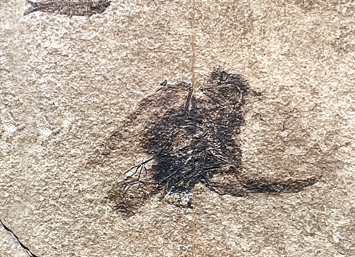 Fig 1. Holotipo del ave Apodiforme fósil más Antigua, Eocypselus rowei, encontrado en estratos del Eoceno temprano (~52 millones de años de antigüedad) de la formación Green River, Wyoming, Estados Unidos de Norteamérica. Estos antiguos apodiformes son morfológicamente intermedios entre los vencejos y los colibrís, y de muy pequeño tamaño, y probablemente no ocupaban un nicho ecológico de insectívoros de vuelo sostenido similar al de los vencejos (Apodidae) actuales