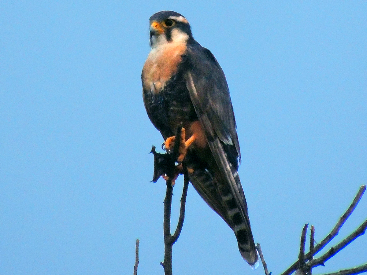 Fig 3. Un Halcón Aplomado, Falco femoralis, con un murciélago capturado durante su emergencia vespertina de un refugio cavernícola. Esta especie de aves rapaz es un frecuente depredador de murciélagos en las áreas de tierras bajas del estado de Veracruz