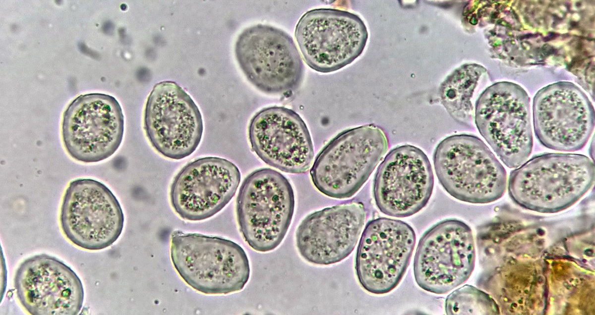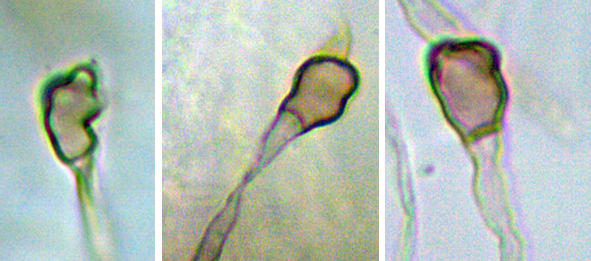 Esporas observadas al microscopio del hongo biótrofo que produce la enfermedad de la roya en arándano