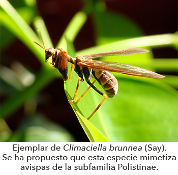Otro aspecto muy interesante de estos organismos es la presencia de mimetismo en algunas especies. El mimetismo es la similitud en forma o color, entre otros, de dos o más organismos que comparten el mismo hábitat, por el cual al menos uno de ellos obtiene un beneficio. Hay estudios que proponen que miembros del género Climaciella Enderlein (Mantispinae), en particular la especie C. brunnea (Say), mimetizan avispas de la subfamilia Polistinae (Vespidae). La similitud de esta especie con las avispas está dada por su coloración, forma del cuerpo, postura y comportamiento. Pero, ¿qué beneficio podría obtener el mantíspido al mimetizar a la avispa? Al parecer, esta similitud podría persuadir a los depredadores para no molestar a los mantíspido, pues las avispas mimetizadas son agresivas. Otro posible beneficio considera que estas avispas visitan flores para alimentarse, lo mismo que otros insectos como abejas, moscas, mariposas, escarabajos, entre otros. El mantíspido podría tomar ventaja de su similitud con la avispa para no ser percibido como un depredador y así poder atrapar y alimentarse de los otros insectos que visitan las flores.