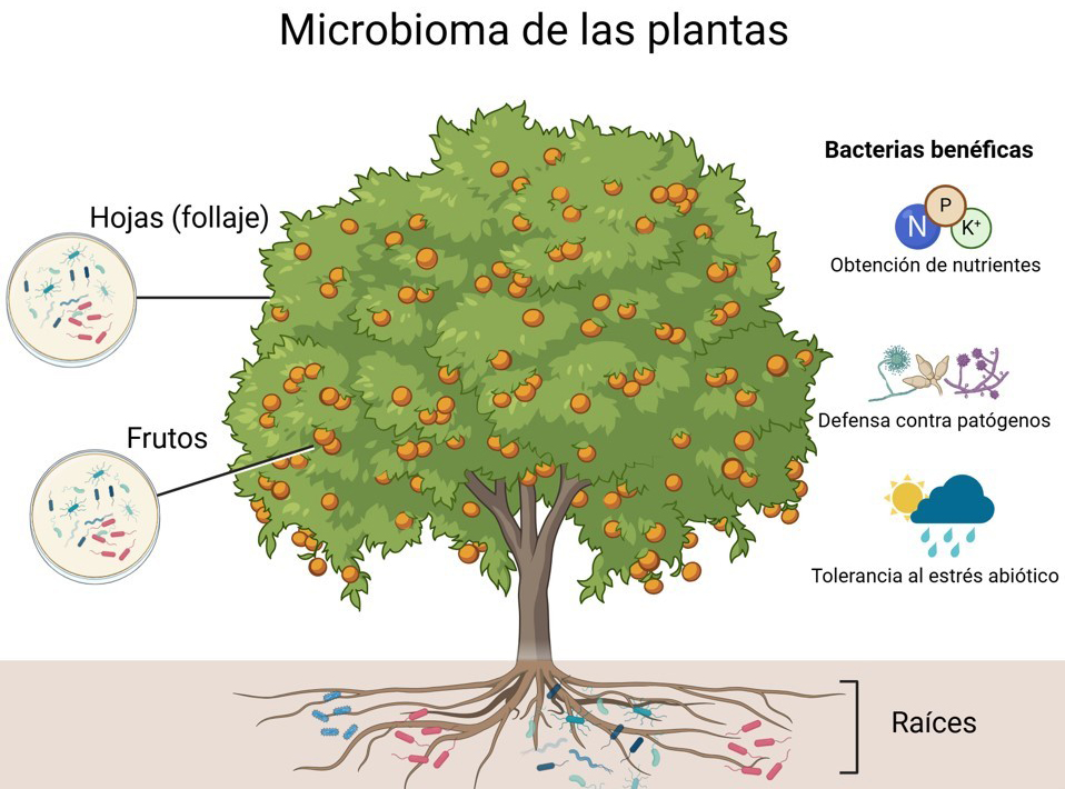 Fig 2. El microbioma de las plantas se encuentra asociado a diferentes partes de la planta y juega un papel importante para el desarrollo de las plantas. Imagen hecha con BioRender.