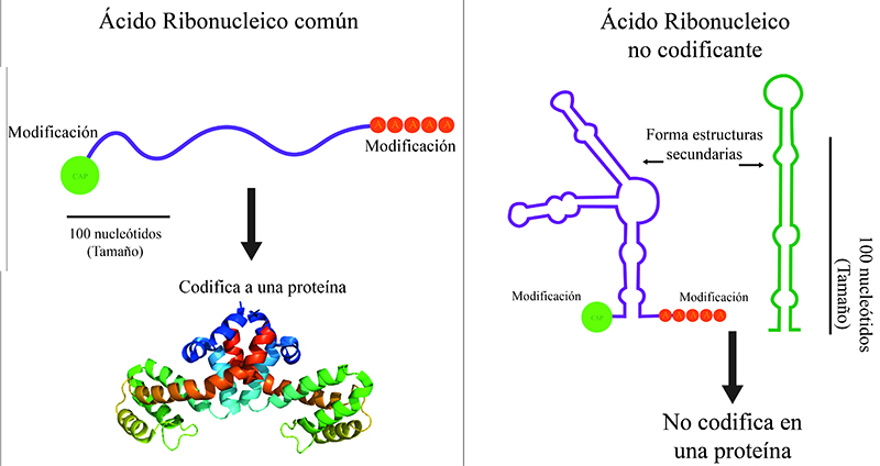 Figura 1. Características estructurales que diferencian a un ARN-lnc de un ARN común. Un ARN-lnc puede o no presentar modificaciones en los extremos de la molécula, también pueden adquirir estructuras secundarias, son de tamaño más pequeño que un ARN común y finalmente su secuencia no codifica en alguna proteína (Autor: Michel Pale Rivas)