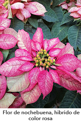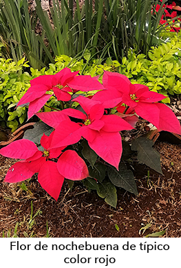 La flor de nochebuena, que no puede faltar en las festividades decembrinas como parte de las decoraciones es conocida con otros muchos nombres comunes, algunos de ellos son: Poinsettia, Flor de Pascua, Estrella de navidad, Flor de fuego, etc. Su nombre científico es Euphorbia pulcherrima (el epíteto latino pulcherrima significa: “la más bella”). Es originaria de México y Centroamérica y es actualmente la planta cultivada en maceta más vendida de todo el mundo. México produce aproximadamente 25 millones de plantas de esta especie cada año, pero a nivel mundial es el estado de California en Estados Unidos donde se cultiva en un mayor volumen. A la fecha, se han generado más de 60 híbridos con diferentes colores y formas.