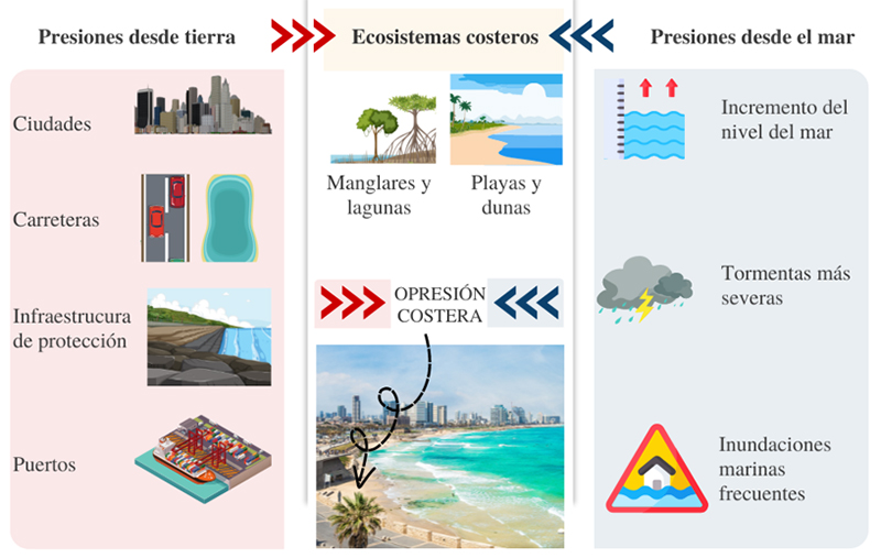 La opresión costera es un proceso en el cual la permanencia de los ecosistemas costeros se ve amenazada por eventos que están ocurriendo simultáneamente en los océanos y en los continentes. Por un lado, el cambio climático ha causado el incremento en el nivel medio del mar y una mayor frecuencia e intensidad de las tormentas, fenómenos que pueden ocasionar procesos de erosión acelerada debido a que las olas tienen un mayor alcance en la costa. Además, aumentan las inundaciones y la salinidad del agua del subsuelo. Dado que las costas son ambientes muy dinámicos, la respuesta esperada a las presiones antes mencionadas es que los ecosistemas y las especies de esta zona migren tierra adentro, para disminuir la exposición a la salinidad y las inundaciones. Sin embargo, la presencia de infraestructura humana (como ciudades, carreteras, diques) a lo largo de las costas obstaculiza esta migración y es cuando los ecosistemas comienzan a quedar “oprimidos”, entre los efectos del cambio climático (incremento del nivel del mar y de la intensidad de tormentas) y las ciudades costeras (Figura 1). El resultado es que los hábitats costeros están desapareciendo como consecuencia de la opresión costera.
