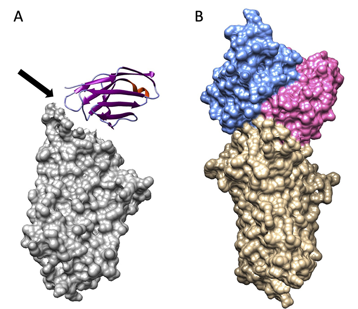 Interacción entre la adiponectina y el receptor de adiponectina adipoR1. (A) El receptor adipoR1 se muestra en gris y la adiponectina en color purpura. En esta imagen solo se observa una de las adiponectinas que interactúan con adipoR1 y con una flecha se muestra la región de contacto entre las dos proteínas. (B) se observa el receptor adipoR1 en color oro y las dos adiponectinas interactuando entre ellas y también con adipoR1. Las estructuras de las proteínas se obtuvieron del Protein Data Bank (6u66 y 5lxg). Las imágenes se generaron con UCSF Chimera (https://www.cgl.ucsf.edu/chimera/)