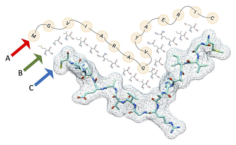 Representación de la región de una proteína. A. Indica, cada aminoácido que está presente está representado por un círculo amarillo y cada letra indica el código para nombrar os aminoácidos con una letra. B. representación en esferas y varillas de los aminoácidos que forma el segmento de la proteína. C. Representación de la región de una proteína, apreciando que los aminoácidos están unidos en semejanza a una cadena con eslabones. La figura se generó con ayuda de ESM-fold (https://esmatlas.com/resources?action=fold) y BioRender (https://www.biorender.com/)
