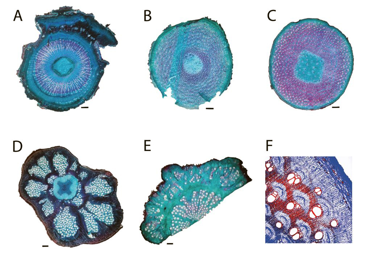 Fig. 2 Secciones transversales de tallos: A) Agasnoma sp., B) Bougainvillea sp., C) Pisonia sp., D) Bauhinia sp. E) Merremia sp., F) Acercamiento del sistema vascular de Pisonia sp. escala 1mm.