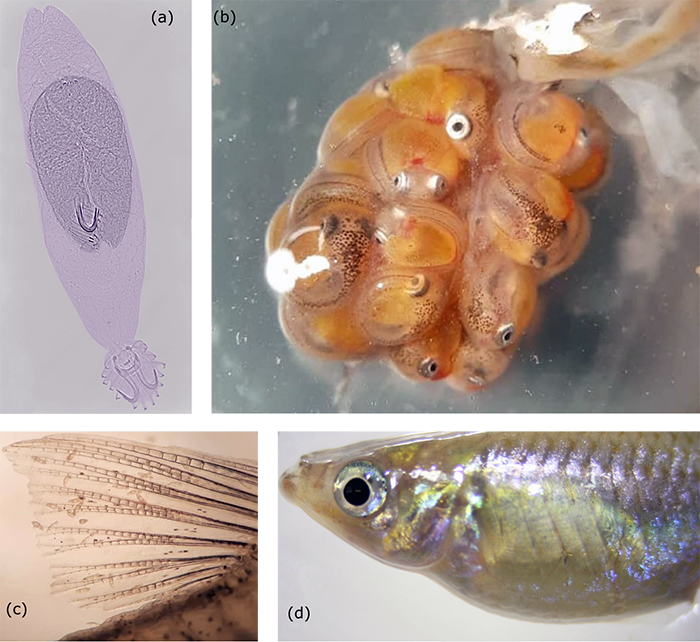Parásitos vivíparos parasitando peces vivíparos. a) Gyrodactylus ticuchi con su hija completamente desarrollada en su interior; b) embriones extraídos del interior de un poecílido; c) aleta de un poecílido parasitada por Gyrodactylus; d) hembra de poecílido. El abultado vientre de las hembras de estos peces, hace que en algunos lugares se les conozca coloquialmente como "tripones". Créditos: a, Ismael Guzmán Valdivieso y Miguel Calixto Rojas; b y c, Juan José Palacios Márquez; d, Natalia Tepox Vivar.