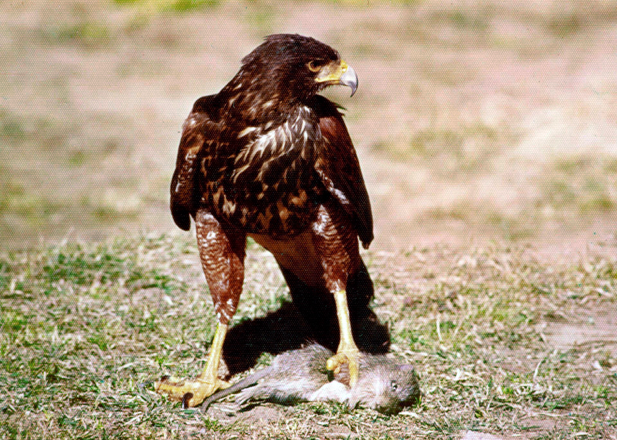 Figura 3. Aguililla rojinegra (Parabuteo unicinctus) con una rata jabalina (Sigmodon hispidus) que capturo. Esta rata sirve de alimento a muchas aves de presa y carnívoros (Foto: A. González-Romero).