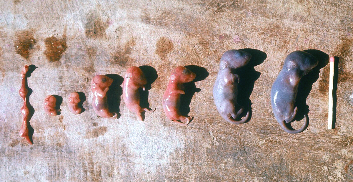 Figura 4. Diferentes estadios de maduración de embriones de la rata jabalina en Tlahualilo, Durango. Esta circunstancia demuestra que este roedor puede reproducirse en forma continua cuando las condiciones son adecuadas (Foto: A. González-Romero)