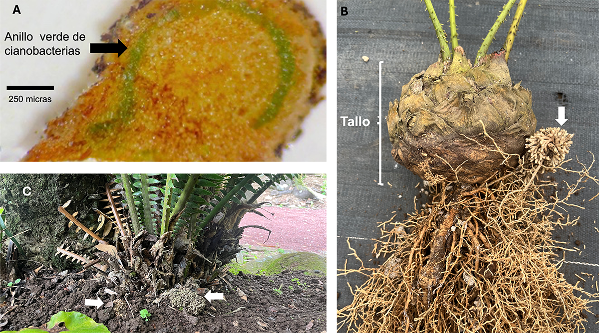 Las cícadas presentan tres tipos de raíces: una raíz pivotante, raíces laterales y raíces especializadas denominadas “raíces apogeotrópicas”, se desarrollan de forma lateral y con geotropismos negativo, lo que permite su emergencia hacia la superficie del suelo. Debido a su apariencia, similar a los corales marinos, estas raíces también se conocen como raíces coraloides formando masas coraloides en la superficie del suelo. En Macrozamia, se ha descrito el proceso de formación de raíces coraloides, que comienza con la aparición de estructuras papilosas o raíces precoraloides, seguidas por fases de maduración, colonización por cianobacterias, diferenciación completa, senescencia y regeneración. Las cianobacterias se alojan en la denominada zona cianobacteriana, una región interna de las raíces coraloides, visible por un distintivo anillo verde. Las cianobacterias predominantes en esta simbiosis pertenecen género Nostoc, caracterizado por su morfología filamentosa. Estos organismos son capaces de fijar nitrógeno atmosférico y transformarlo en compuestos asimilables por la planta. A cambio, la planta provee a los microorganismos un entorno protegido y con nutrientes para su supervivencia.