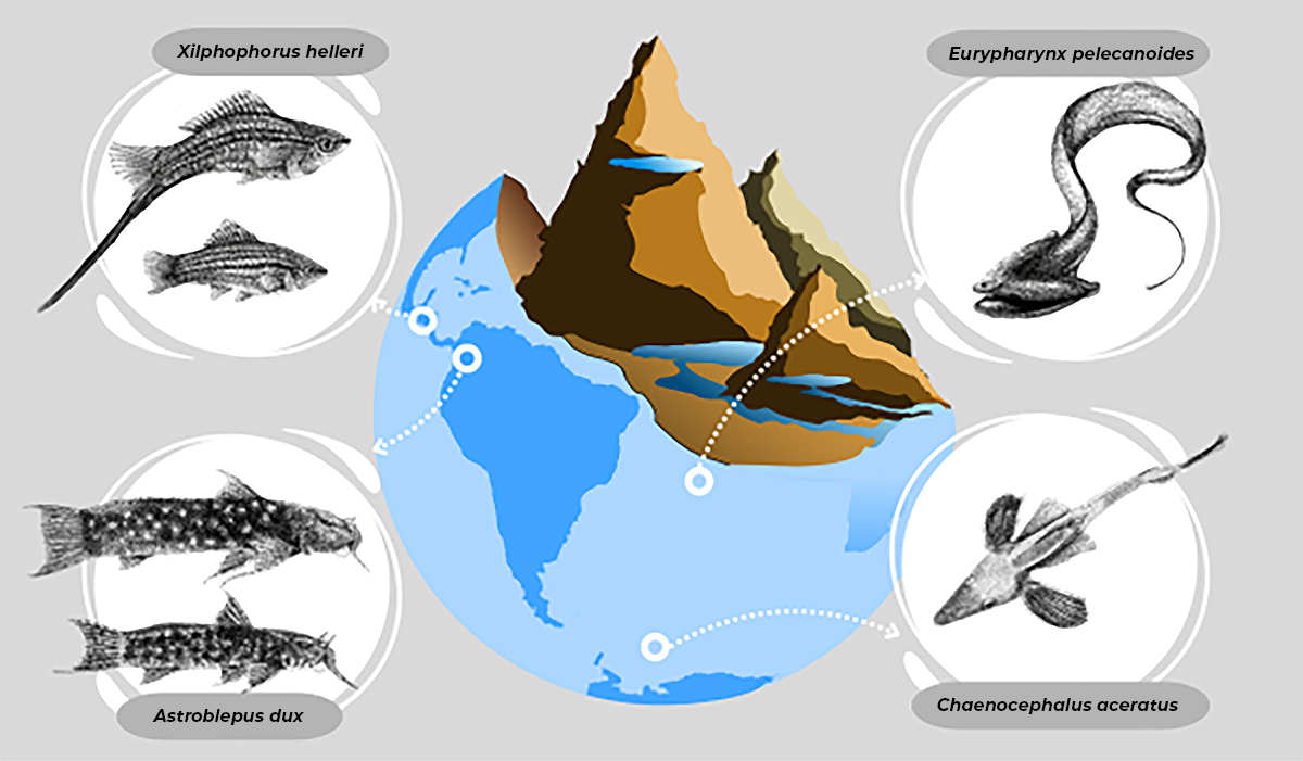 Ilustraciones de las especies Astroblepus dux (capitán), Xiphophorus helleri (Guppys), Chaenocephalus aceratus (pez de hielo), y, Eurypharynx pelecanoides (pez pelicano)