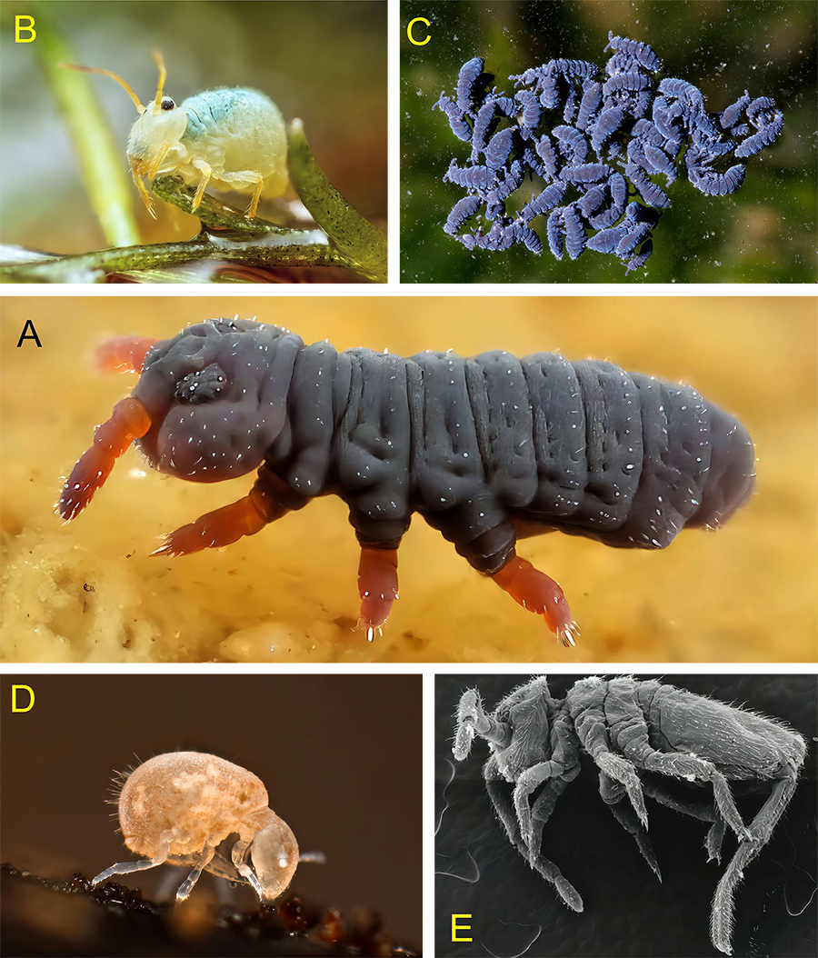 Colémbolos asociados al ambiente acuático. A, Podura aquatica: (Foto tomada de: https://acortar.link/W68vQP); B, Sminthurides aquaticus: (https://acortar.link/NGmWD5); C, Anurida maritima: (https://acortar.link/iJcdxv); D, Neelus sp. (https://acortar.link/pLa35v) y Spinactalestes sp. (https://acortar.link/jUtLIM)