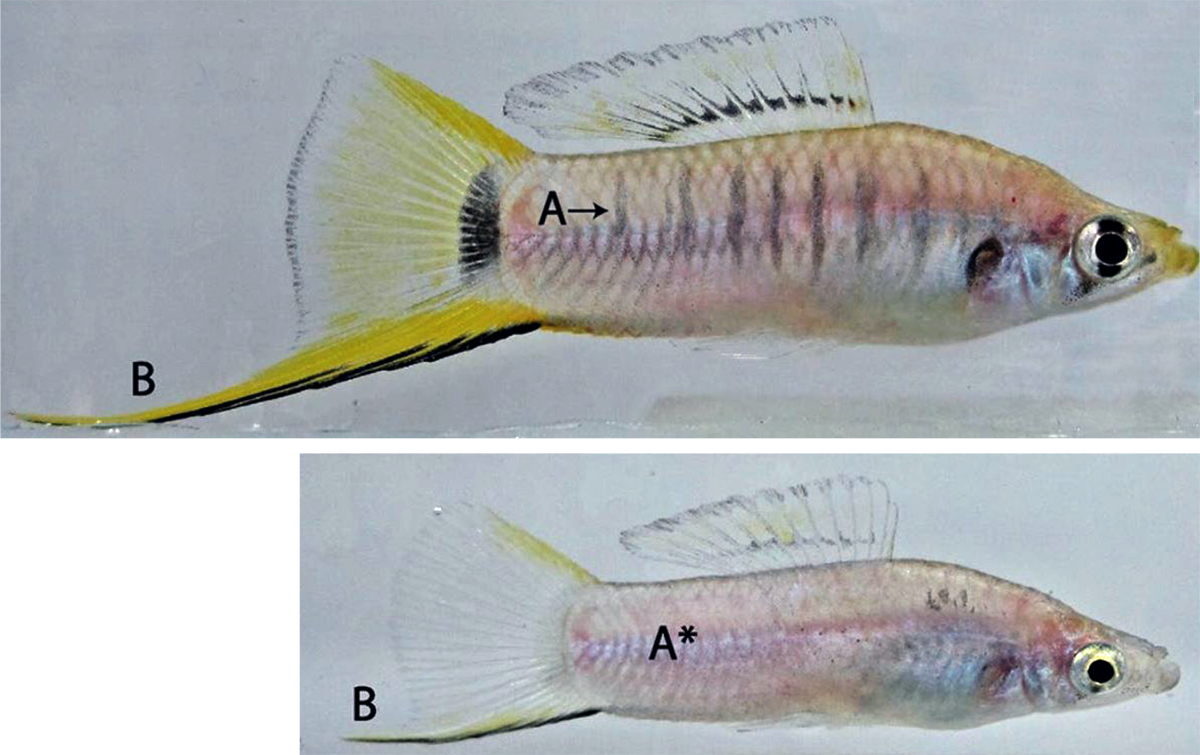 Fig 1. Macho cortejador (arriba) y tramposo (abajo) de la especie Xiphophorus multilineatus. (A) barras corporales verticales; (A*) que generalmente no se presentan en machos tramposos; (B) la espada, extensión de la parte ventral de los rayos de la aleta caudal. Fotos de Luke Weinstein