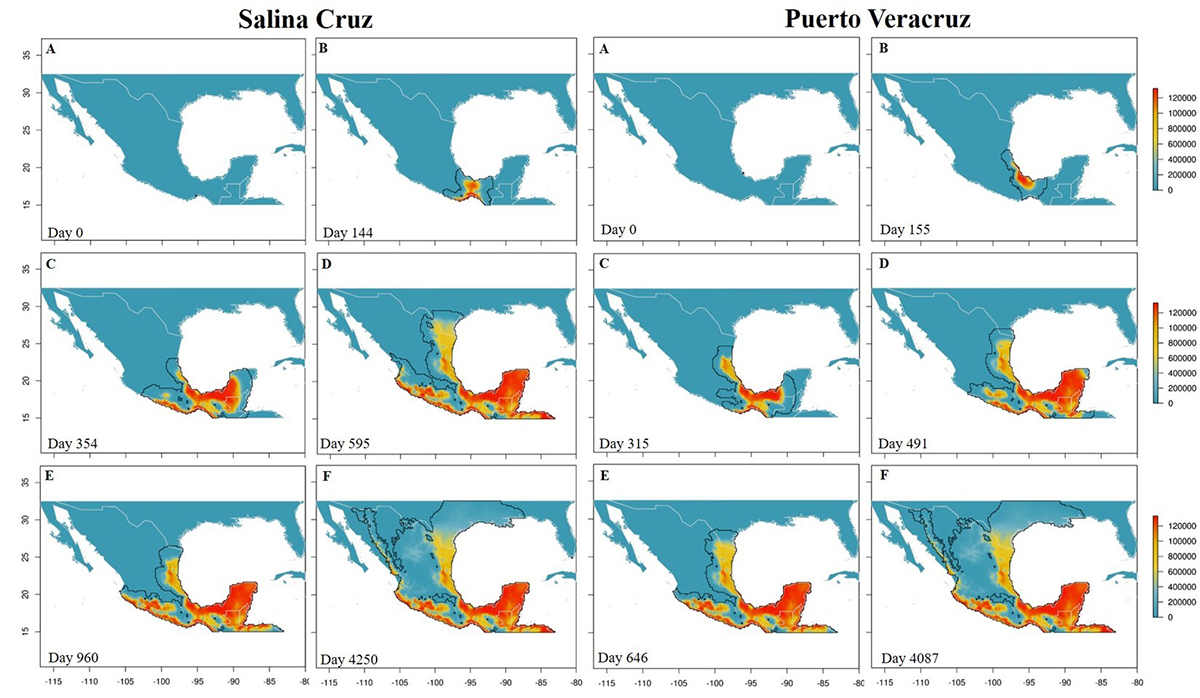 Dinámica de invasión y abundancia predichas para el complejo ambrosial X. bispinatus–H. lauricola desde el puerto de Salina Cruz y Veracruz en diferentes periodos de tiempo. Tomada de Fadda, L.A., Osorio-Olvera, L., Ibarra-Juárez, L.A., et al. Predicting the dispersal and invasion dynamics of ambrosia beetles through demographic reconstruction and process-explicit modeling. Sci Rep 14, 7561 (2024). https://doi.org/10.1038/s41598-024-57590-1