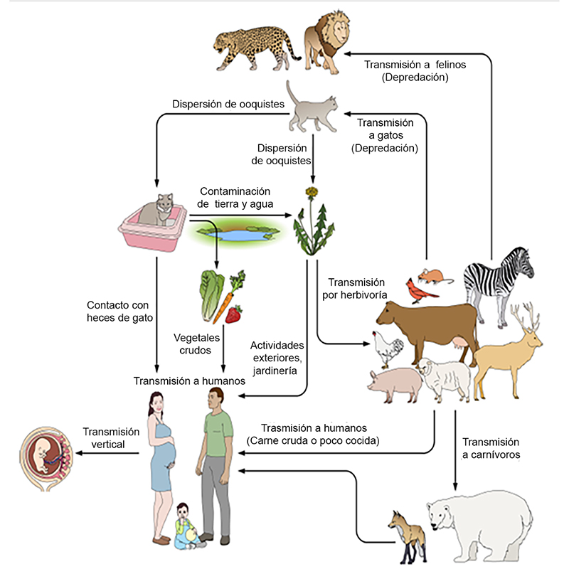 La mayoría de las transmisiones de T. gondii a los humanos son causadas de forma horizontal, por la ingestión de quistes tisulares en carne infectada o por la ingestión ooquistes esporulados presentes en el suelo, el agua o alimentos contaminados, normalmente derivados del medio ambiente o, con menos frecuencia, a partir del contacto directo con heces de felinos infectados. En el caso de las mujeres embarazadas, puede haber transmisión vertical (de la madre al feto) vía placentaria, con complicaciones serias para el feto, fenómeno que se conoce como transmisión congénita (Figura 2). En las distintas especies animales también puede haber transmisión vertical provocando abortos que, en el caso de animales de producción como los bovinos, ovinos y caprinos, puede provocar importantes pérdidas económicas.