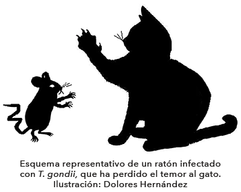 Los gatos son personajes principales de esta historia, ya que son los hospederos principales y junto con el resto de los félidos, son los únicos hospederos en los el que el parásito puede producir los ooquistes que son excretados en las heces hacia el medio ambiente. Estos ooquistes son muy resistentes, por lo que pueden sobrevivir por mucho tiempo y cuando son ingeridos por otros hospederos, como aves, ratones, vacas o incluso humanos, se produce la infección (Figura 2). Dentro del nuevo hospedero los ooquistes emergen y se multiplican, formando quistes tisulares para protegerse de los ataques del sistema inmunitario, en este quiste, el parásito se multiplica muchas veces hasta el punto de romper el quiste y migrar hacia otros órganos, incluido el cerebro, en donde se forman nuevos quistes. El ciclo de replicación del parásito causa la enfermedad conocida como toxoplasmosis, la cual afecta a prácticamente todas las especies de vertebrados del planeta.
