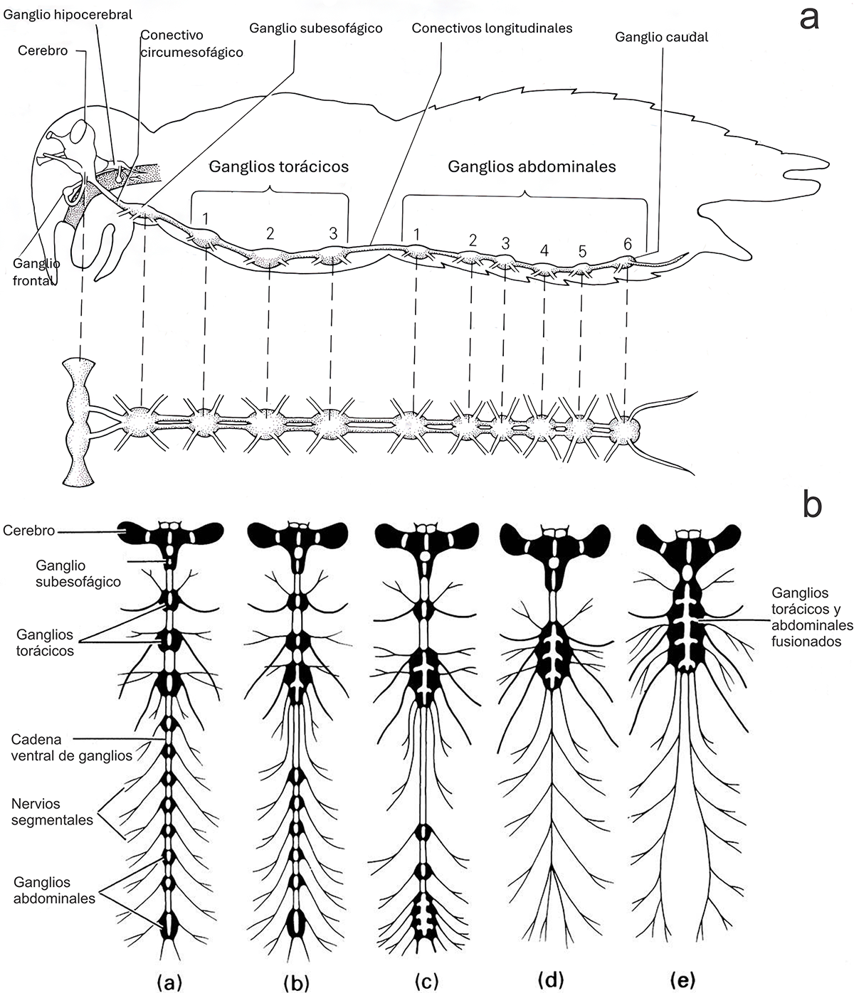 Fig. 1a. Diagrama lateral del cuerpo de un insecto mostrando la disposición del cerebro y la cadena ventral de ganglios (modificada de Romoser, 1973) y Fig. 1b. Modificaciones en la cadena ventral de ganglios: (a) pulga; (b) cucaracha; (c) hormiga; (d) mosca; (e) chinche acuática (modificada de Entomología Pura)