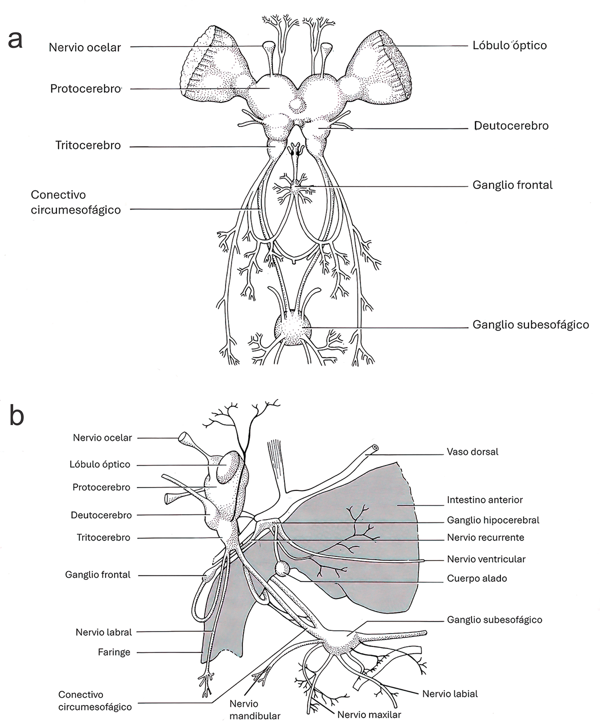 Fig. 2a. Detalle del cerebro y ganglios principales de un insecto en vista dorsal (modificada de Romoser, 1973). Y Fig. 2b. Detalle de los sistemas nervioso central y estomatogástrico y nervios principales en vista lateral. El área gris representa parte del intestino anterior (modificada de Romoser, 1973).